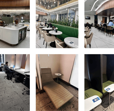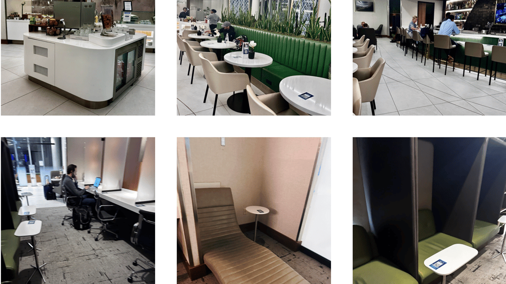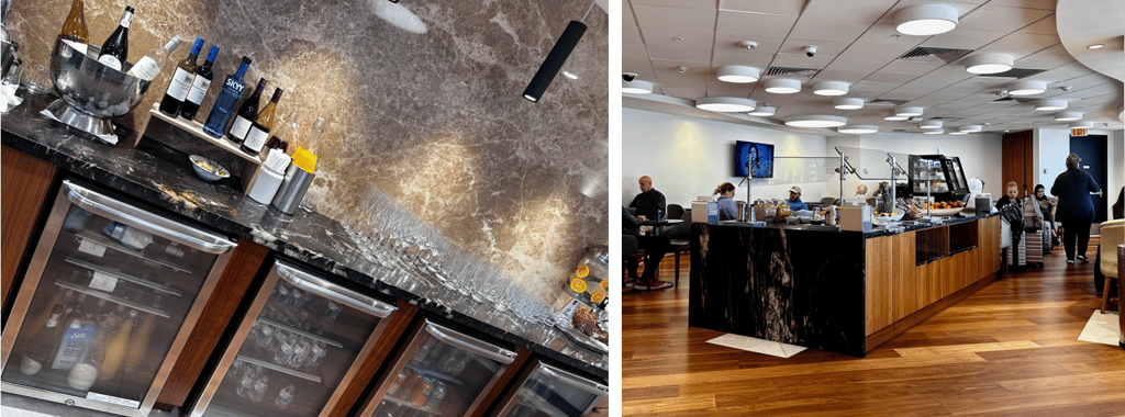 We were there in between the breakfast and lunch timeframe so got to see both food options. Food is set up buffet style. Breakfast had some basic hot food like potatoes and eggs and continental type of items (fruit, yogurt, muffins) and lunch had a few hot dishes like sliders and rice and salads. The food was ok, nothing great, but did the trick. There was also an area where you could get water and snacks and fruit. Staff was attentive and was quick to pick up dirty cups/dishes, etc...Full service bar is also included. I rate this #2 out of these 4 lounges mainly because of the awesome seating and use of space.